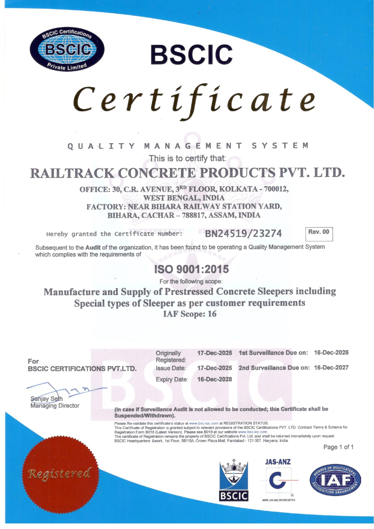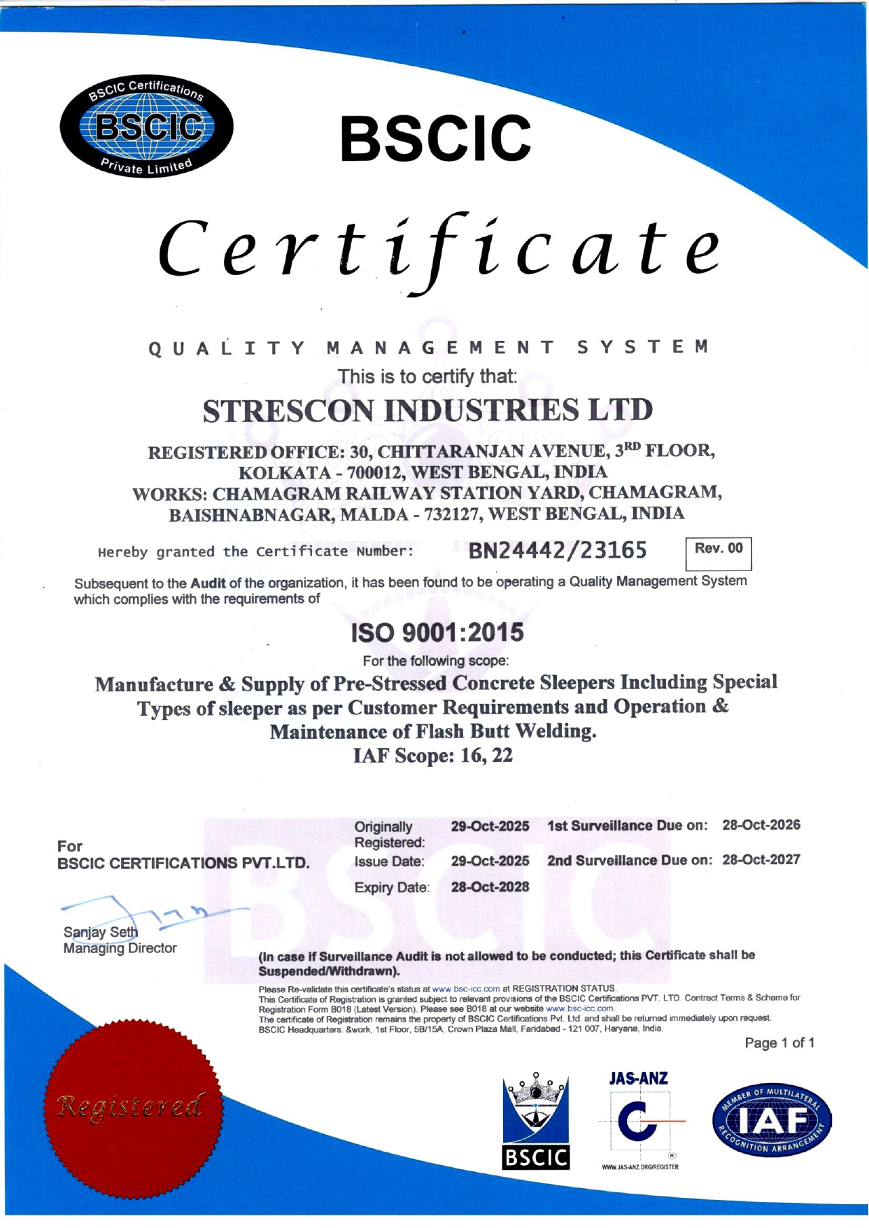 Strescon Industries Limited is an ISO-certified company for its quality management systems in manufacturing pre-stressed concrete sleepers. They are recognized by the Research Designs and Standards Organisation (RDSO) for their quality assurance in railway products.